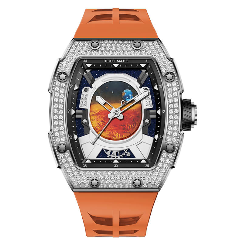 Lấy cảm hứng từ hành trình khám phá vũ trụ, Bexei 9802G Astronaut là sự kết hợp hoàn hảo giữa nghệ thuật chế tác đồng hồ và tinh thần chinh phục. Thiết kế mặt số độc đáo mô phỏng tầm nhìn từ mũ bảo hiểm phi hành gia nhìn ra vũ trụ bao la, mang đến cảm giác viễn tưởng đầy mê hoặc. Trái đất và sao Hỏa được khắc họa sống động, nhấn mạnh tinh thần khám phá không ngừng nghỉ.
