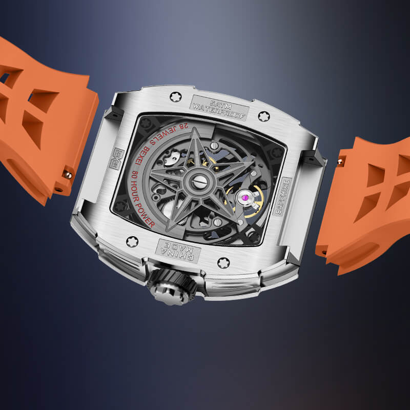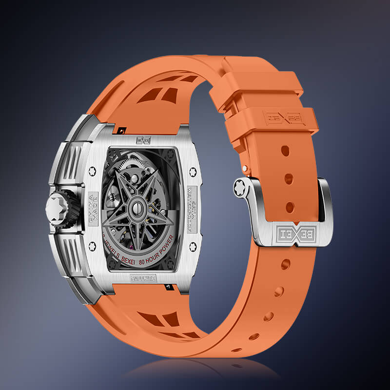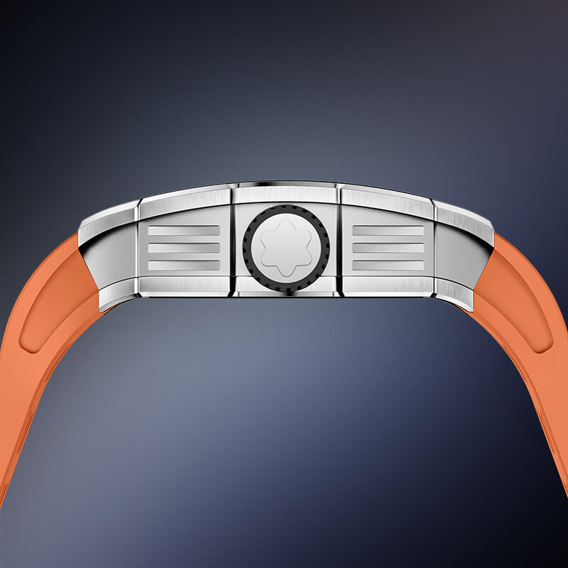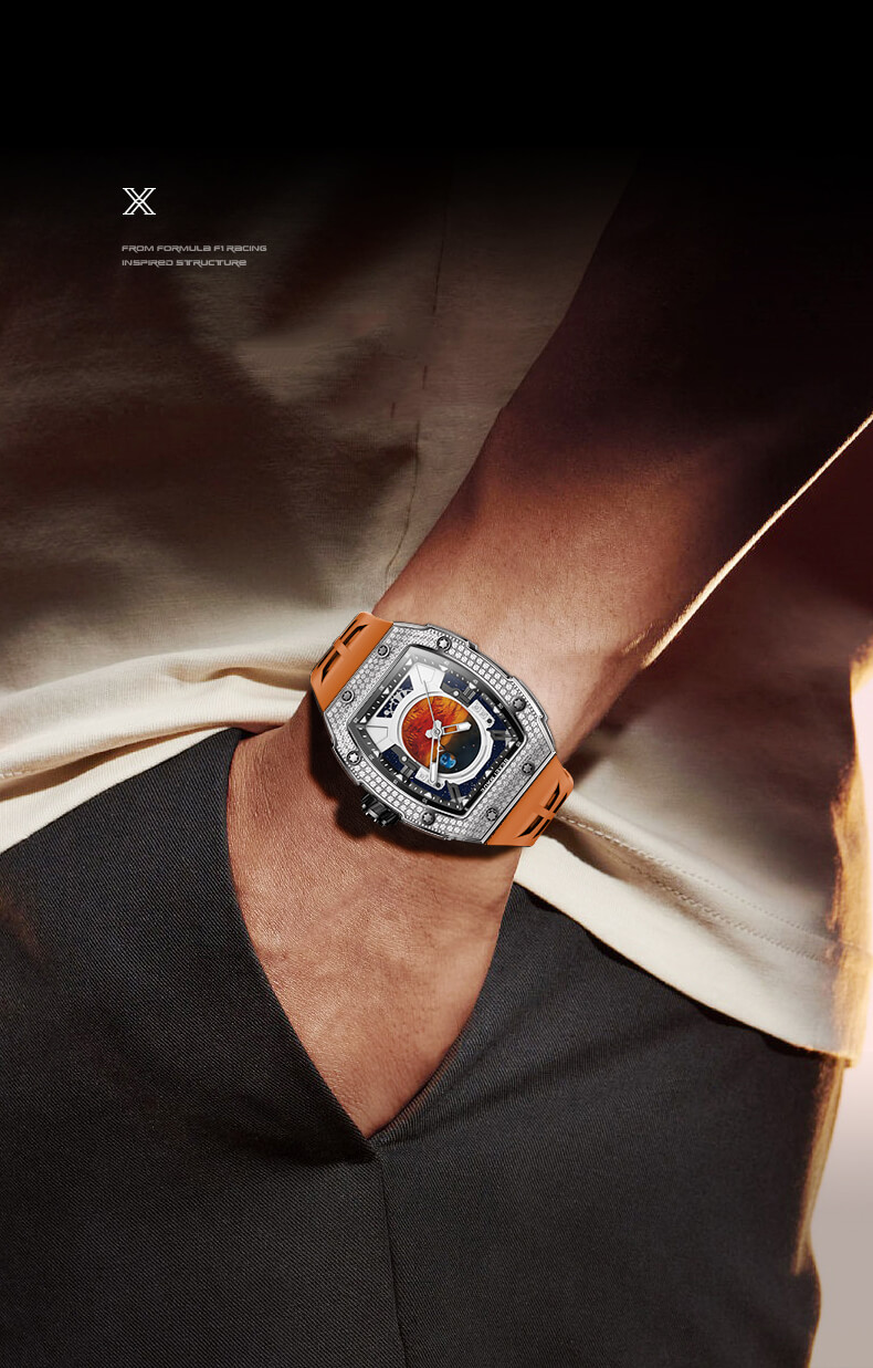 Khung vỏ wine barrel đính đá lấp lánh, kết hợp cùng dây cao su cam trẻ trung tạo nên vẻ đẹp hiện đại, cá tính nhưng vẫn sang trọng. Bộ máy automatic chính xác, vận hành mạnh mẽ là minh chứng cho đẳng cấp của những quý ông yêu công nghệ và đam mê phiêu lưu.