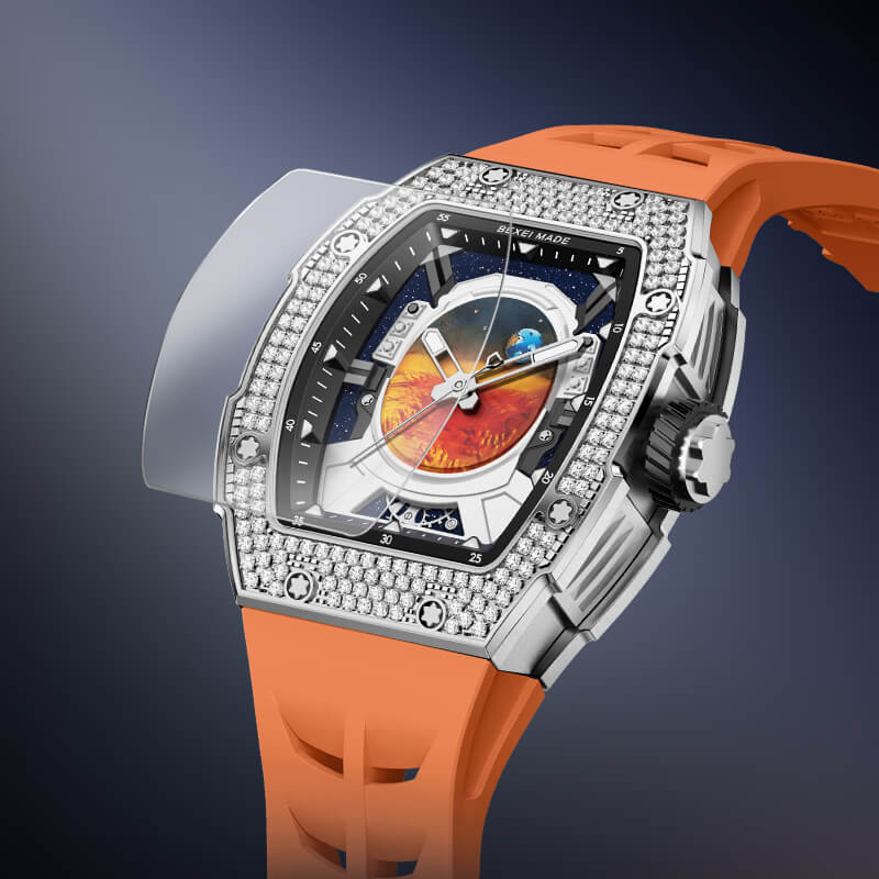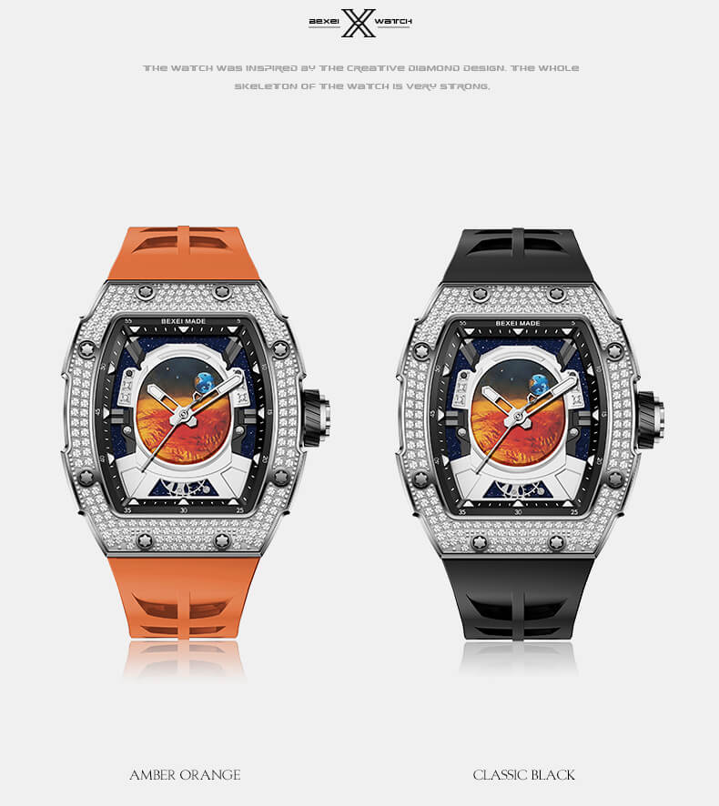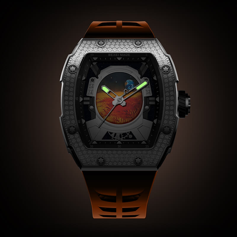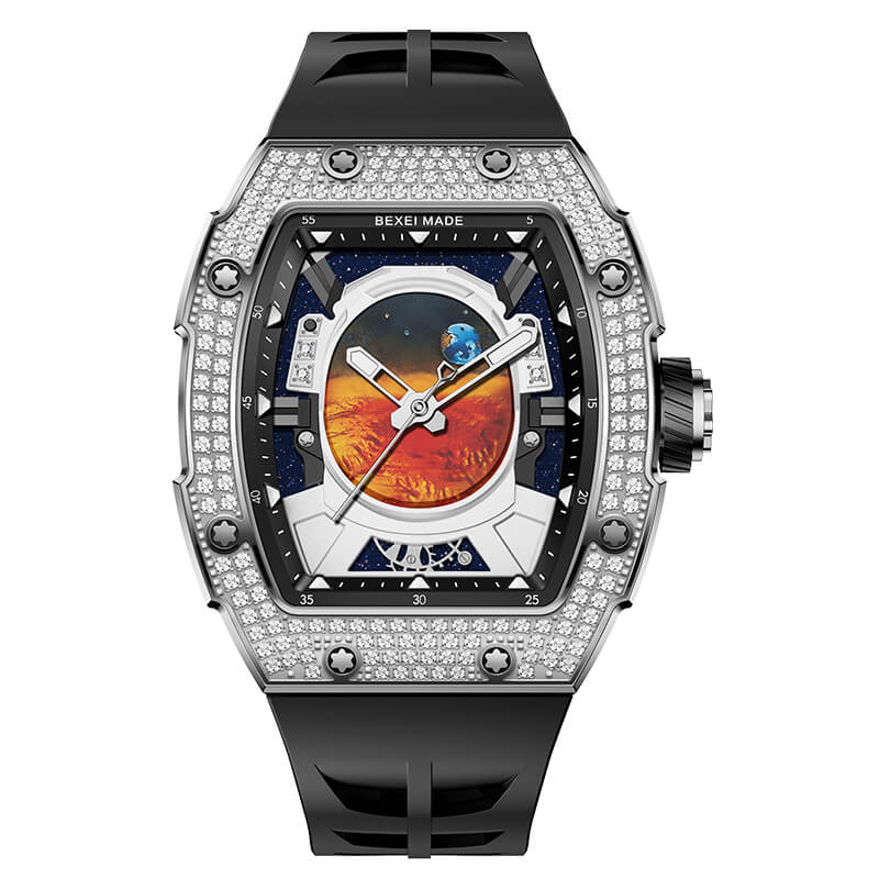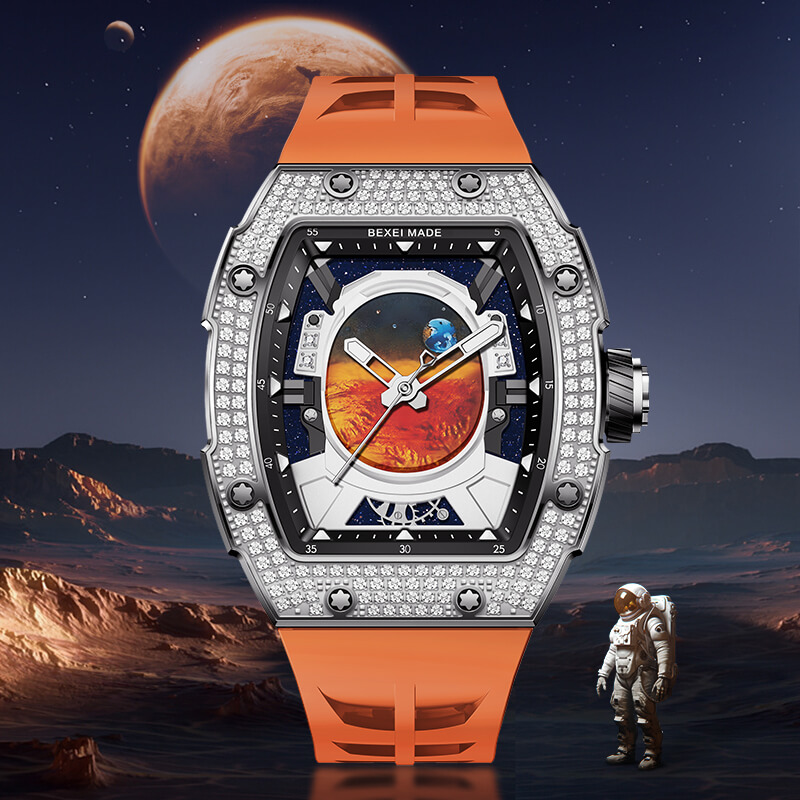 Lấy cảm hứng từ hành trình khám phá vũ trụ, Bexei 9802G Astronaut là sự kết hợp hoàn hảo giữa nghệ thuật chế tác đồng hồ và tinh thần chinh phục. Thiết kế mặt số độc đáo mô phỏng tầm nhìn từ mũ bảo hiểm phi hành gia nhìn ra vũ trụ bao la, mang đến cảm giác viễn tưởng đầy mê hoặc. Trái đất và sao Hỏa được khắc họa sống động, nhấn mạnh tinh thần khám phá không ngừng nghỉ.
