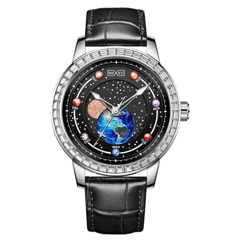 Mỗi chi tiết đều được chế tác tinh xảo, từ mặt kính vòm lấp lánh đến vòng bezel đính đá sang trọng, tạo nên tổng thể vừa hiện đại, vừa đậm chất chiêm tinh học. Bexei 9227G không chỉ là đồng hồ xem giờ – đó là tuyên ngôn phong cách, là công cụ kết nối bạn với những chuyển động kỳ diệu của vũ trụ.