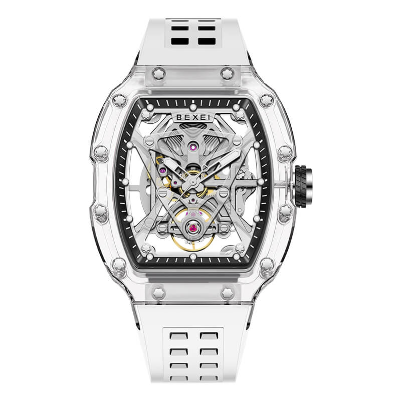 Thiết kế mặt kính trong suốt hai mặt, kết hợp bộ máy cơ tinh xảo lộ cơ, giúp người dùng cảm nhận trọn vẹn chuyển động mạnh mẽ bên trong. Các chi tiết được hoàn thiện tỉ mỉ, từ viền ốc vít kim loại nổi bật đến dây đeo thể thao hiện đại, tất cả tạo nên một tổng thể vừa mạnh mẽ, vừa thời thượng.