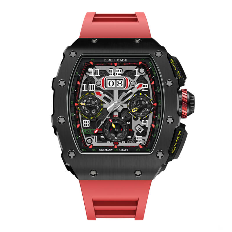Lấy cảm hứng từ thiết kế biểu tượng Richard Mille, Bexei 9032G là sự hòa quyện giữa tinh thần thể thao tốc độ và nghệ thuật chế tác đỉnh cao. Với bộ vỏ hình tonneau đặc trưng, kết hợp chất liệu thép không gỉ đánh xước mờ và mặt kính sapphire chống xước, mẫu đồng hồ này toát lên vẻ mạnh mẽ, hiện đại nhưng không kém phần tinh tế.