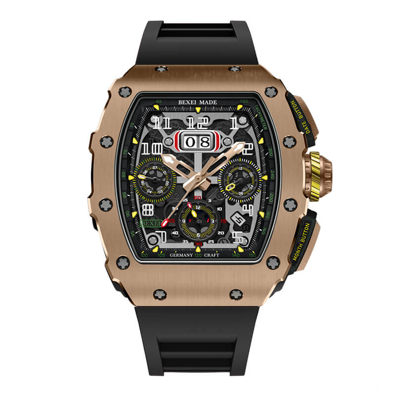 Lấy cảm hứng từ thiết kế biểu tượng Richard Mille, Bexei 9032G là sự hòa quyện giữa tinh thần thể thao tốc độ và nghệ thuật chế tác đỉnh cao. Với bộ vỏ hình tonneau đặc trưng, kết hợp chất liệu thép không gỉ đánh xước mờ và mặt kính sapphire chống xước, mẫu đồng hồ này toát lên vẻ mạnh mẽ, hiện đại nhưng không kém phần tinh tế.