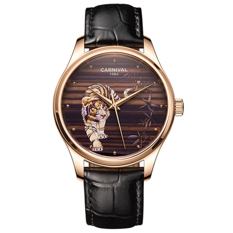 Đồng hồ Carnival C515G-3 chạm khắc hổ vàng sang trọng đẳng cấp cho quý ông. Hổ là loài vật linh thiêng và đầy uy quyền thường được thờ phụng, chính vì thế hổ là biểu tượng cho quyền lực, cho công danh học hành và sự tăng tiến trong kinh doanh. Là vật khí của công danh, tài lộc và quyền lực. Mang nguyên khí Kim là cát khí đem lại sự may mắn về công danh, tài lộc, học hành thi cử. Cũng có thể dùng để trấn yểm khi nhà bị phạm vào cấm lỵ hoặc bị Sát tinh chiếu hướng.